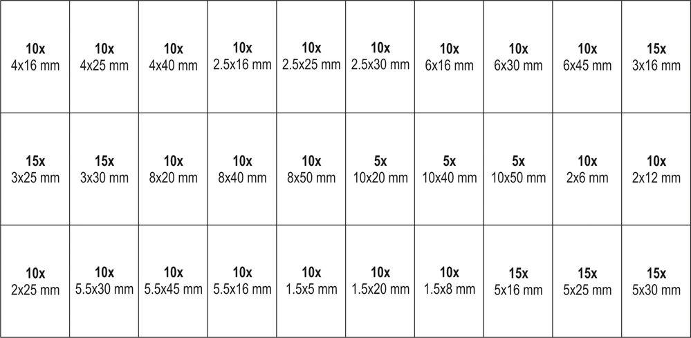 Zestaw 315 sztuk kołków sprężystych/rozprężnych. Zestaw zawiera rozmiary od 1.5x5 mm do 10x50 mm. Całość umieszczono w wygodnym opakowaniu typu "sortownik".