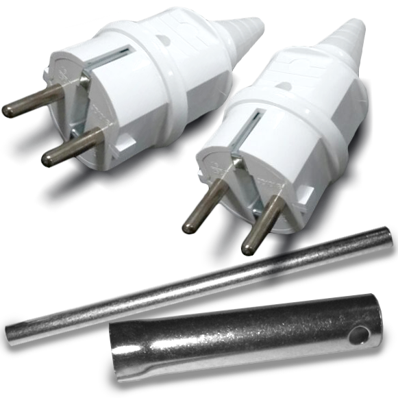 Generator wyposażony jest w dodatkowe akcesoria: dwie wtyczki przenośne 2P+PE 16A 230V oraz klucz do świec.
