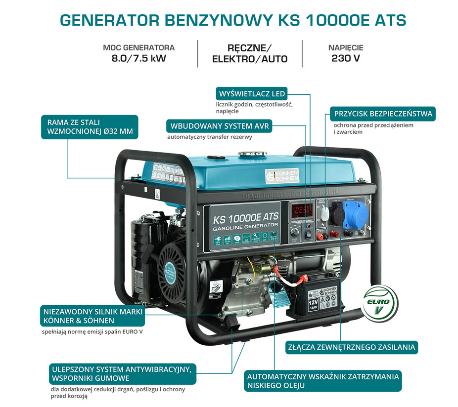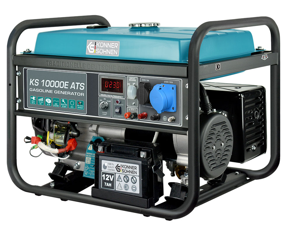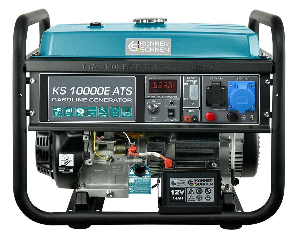 Agregat prądotwórczy KS 10000E ATS Konner&Sohnen to nowoczesne urządzenie do produkcji prądu elektrycznego 1-fazowego o napięciu 230V przy częstotliwości 50Hz. Znajduje zastosowanie w miejscach z brakiem dostępu do energii elektrycznej z sieci, jak również w domu podczas ewentualnej awarii instalacji elektrycznej. Umożliwia zasilanie różnego rodzaju elektronarzędzi i innych urządzeń elektrycznych o maksymalnej mocy do 8,0 kW. Posiada wiele nowatorskich rozwiązań, a także udogodnień wpływających bezpośrednio na jego stabilność i długą żywotność.