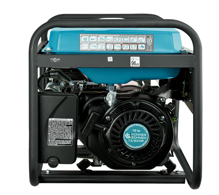 • Generatory «Könner & Söhnen» wyposażone są w stalowy nadwymiarowy zbiornik paliwa, co wydłuża czas pracy generatora bez tankowania. Na zbiorniku znajduje się wskaźnik poziomu paliwa dla wygody użytkowania