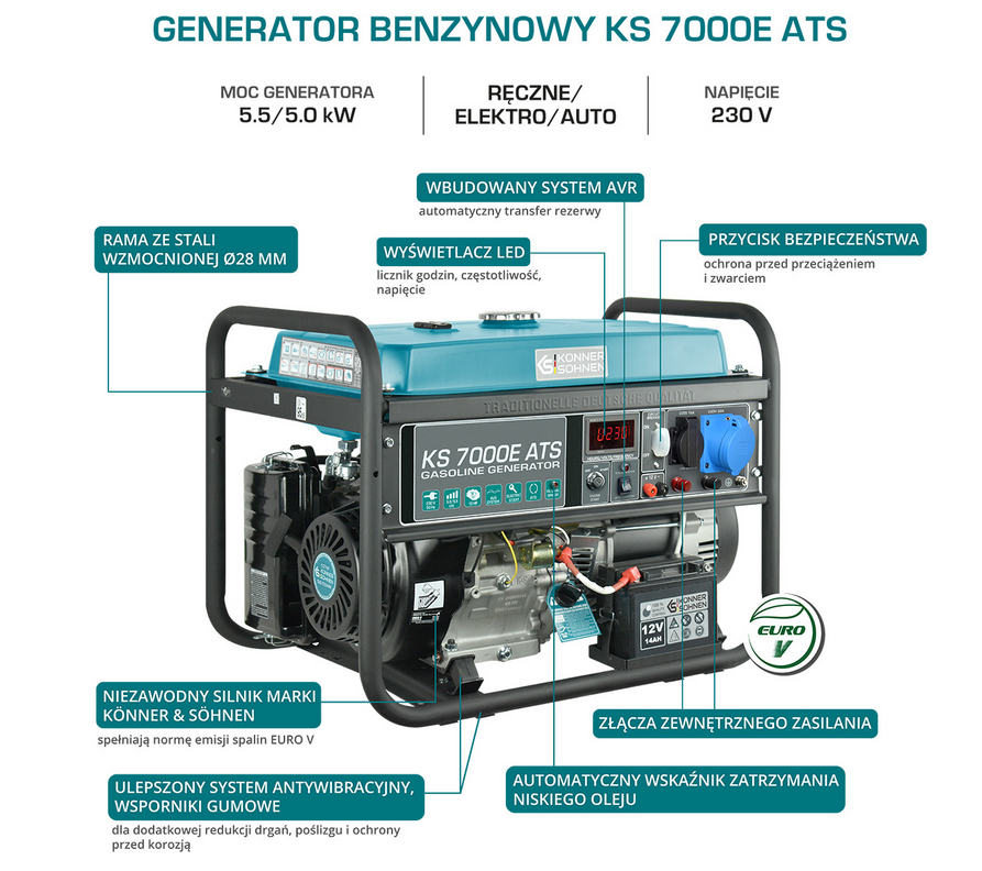 Agregat prądotwórczy KS 7000E ATS Konner&Sohnen to niezwykle przydatne urządzenie do produkcji prądu elektrycznego 1-fazowego o napięciu 230V przy częstotliwości 50Hz. Znajduje zastosowanie w miejscach z brakiem dostępu do energii elektrycznej z sieci, jak również w domu podczas ewentualnej awarii instalacji elektrycznej. Umożliwia zasilanie różnego rodzaju elektronarzędzi i innych urządzeń elektrycznych o maksymalnej mocy do 5,5 kW. Posiada wiele nowatorskich rozwiązań, a także udogodnień wpływających bezpośrednio na jego stabilność i długą żywotność.