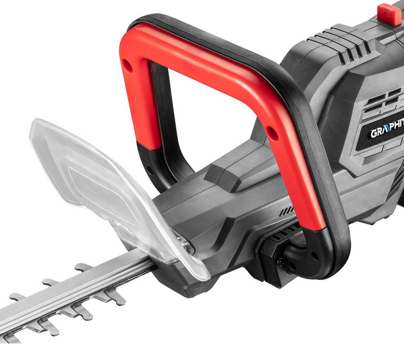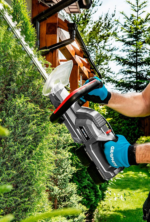 Nożyce akumulatorowe do żywopłotu Graphite 58G042 to wydajne narzędzie ogrodowe do efektywnej pielęgnacji żywopłotów i krzewów. Nożyce 58G042 zasilane są dwoma akumulatorami 18V Li-Ion Graphite Energy+, co pozwala na szybkie i wygodne przycinanie roślin. Graphite 58G042 umożliwiają przycinanie żywopłotu, krzewów i innych roślin, gdzie grubość łodygi nie przekracza 20 mm. Nożyce do żywopłotu Graphite 58G042 posiadają ostrze o długości 59,5 cm co przekłada się na maksymalną szerokość cięcia wynoszącą 52 cm. W celu poprawy bezpieczeństwa pracy nożyce Graphite wyposażono w zabezpieczenie przed przypadkowym włączeniem oraz osłony części nożowej i dłoni. Regulowana rękojeść główna nożyc umożliwia dopasowanie narzędzia do pozycji pracy operatora.