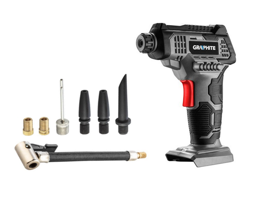 Kompresor bezolejowy Graphite 58G041 to przenośne narzędzie do generowania sprężonego powietrza stosowanego w różnorodnych drobnych zadaniach, jak pracach na wysokości, czy pracach hobbystycznych. Kompresor Graphite 58G041 jest zasilany akumulatorami Graphite 18V i wytwarza maksymalne ciśnienie na poziomie 7 barów. Bezolejowa konstrukcja kompresora eliminuje potrzebę konserwacji i zapewnia czyste powietrze. Kompresor akumulatorowy Graphite 58G041 sprawdzi się przy pompowaniu opon samochodowych, rowerowych, piłek i wielu innych przedmiotów. Dzięki zasilaniu akumulatorowemu 18 V, jest wygodny i mobilny, pozwalając na użytkowanie w różnych miejscach. Różne rodzaje końcówek do pompowania pozwalają na różnorodne zastosowanie.