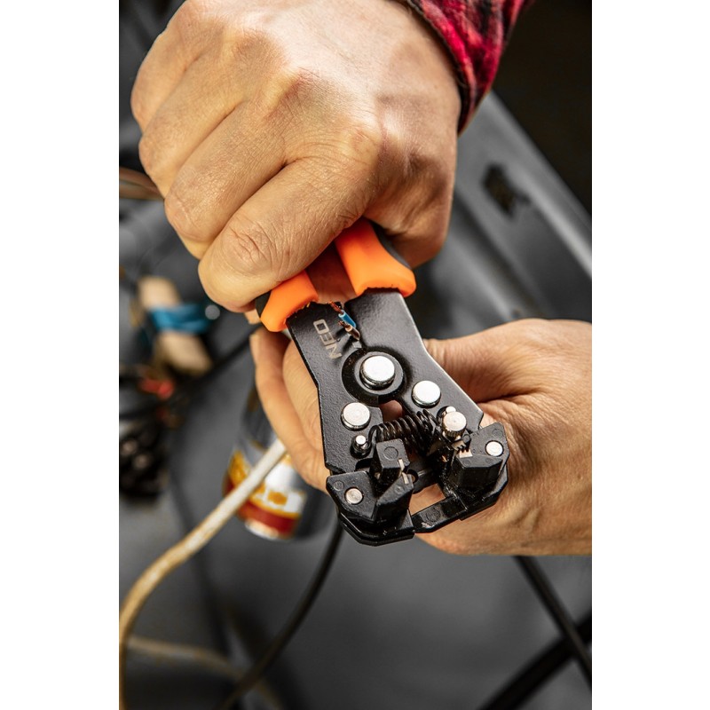 Automatyczny ściągacz izolacji NEO (nr ref. 01-540) czołowy, o rozmiarze 200 mm służy do ściągania izolacji oraz zaciskania końcówek konektorowych. Zakres pracy dla ściąganych izolacji od 0.5 do 6 mm2 (22-10 AWG), oraz dla zaciskania końcówek 0.5 do 8 mm2.