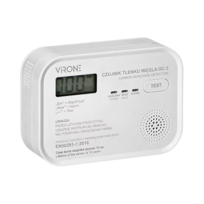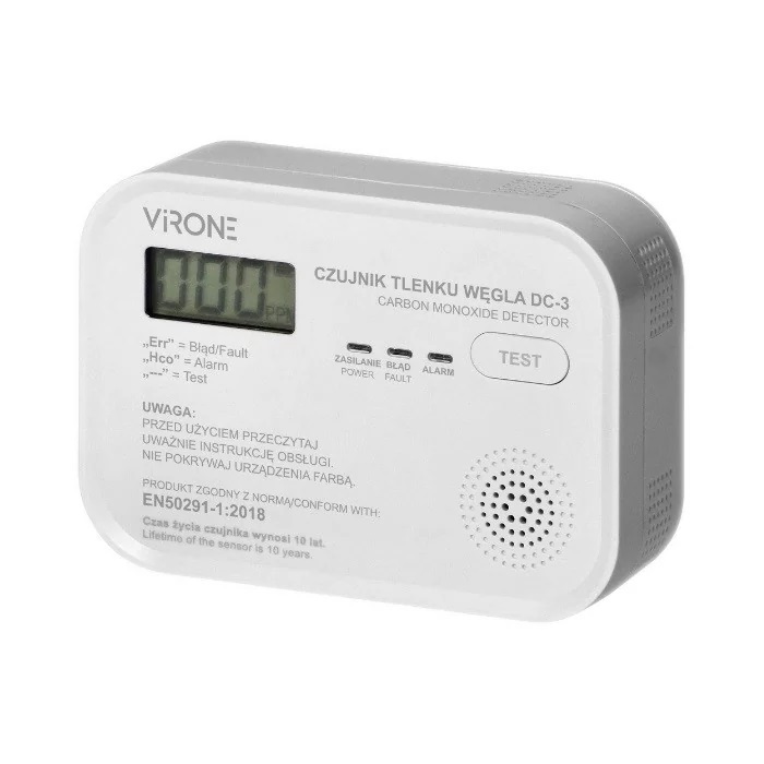 Detektor tlenku węgla (czadu) Virone DC-3-TEST przeznaczony do monitorowania pomieszczeń pod kątem obecności tlenku węgla (czadu).