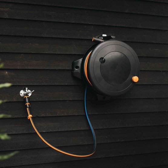 Kompaktowy, łatwy w użyciu zestaw do podlewania: zawiera wąż, bęben, dyszę zraszającą i przyłącza