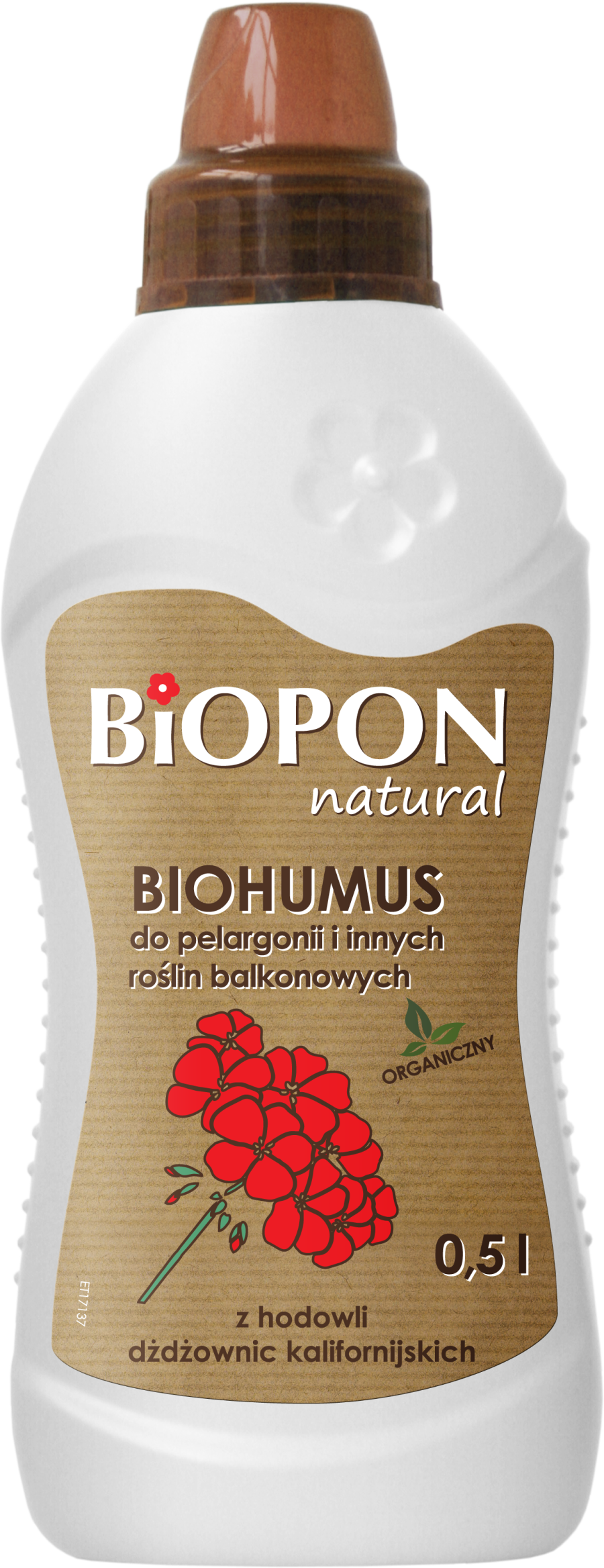 Organiczny środek poprawiający właściwości gleby i wzbogacający ją w składniki pokarmowe, powstały na bazie biohumusu, przeznaczony do stosowania w uprawie wszystkich gatunków pelargonii i innych roślin balkonowych.