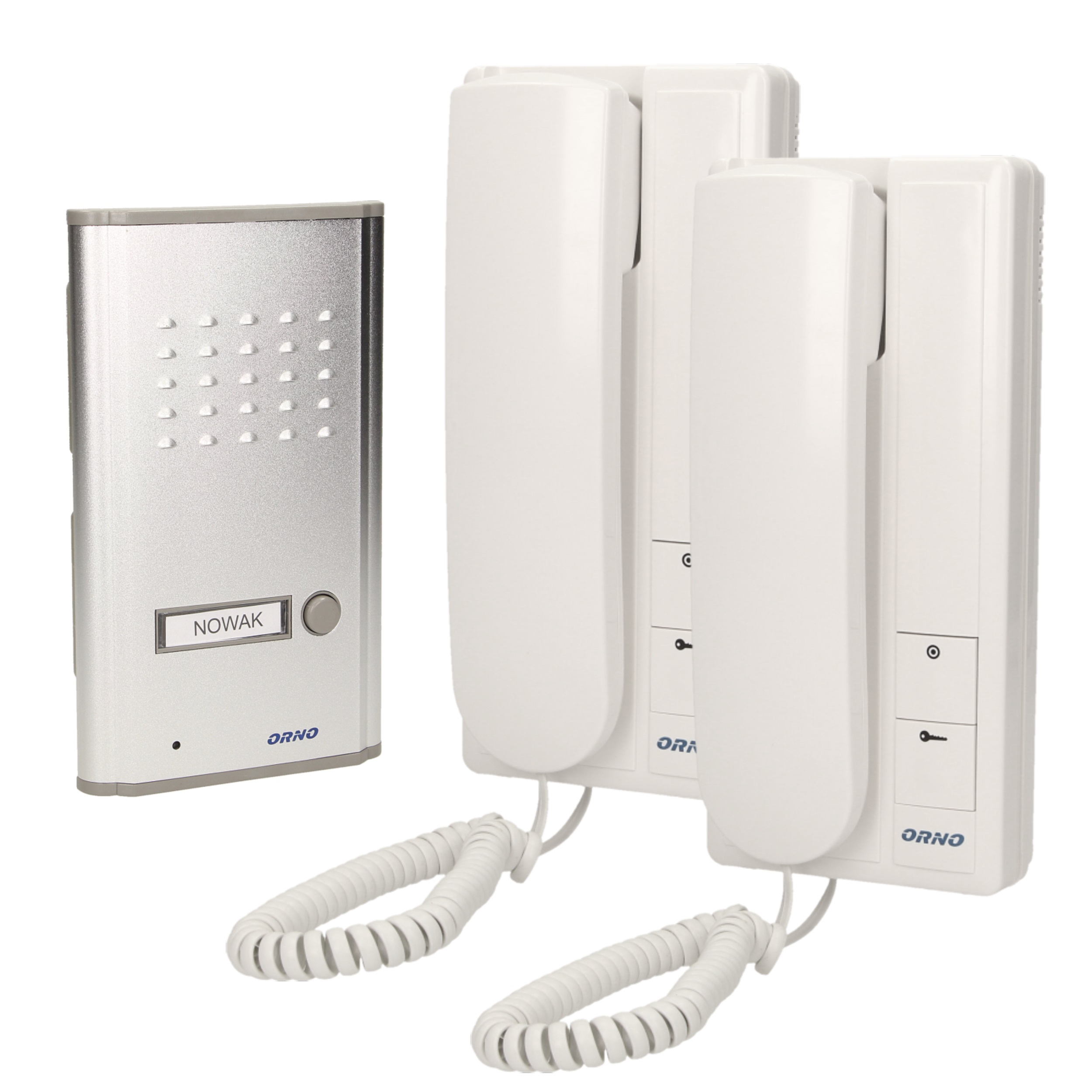 Zestaw domofonowy jednorodzinny z interkomem (komunikacja między dwoma unifonami), montaż podtynkowy, zastosowanie osłony OR-DOM-RL-901DN umożliwia montaż natynkowy, podświetlane miejsce na nazwisko, jeden z unifonów posiada wbudowany zasilacz i przewód zasilający, elektrozaczep nie wymaga dodatkowego zasilania.