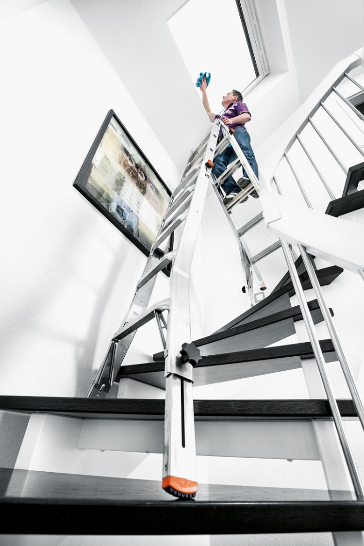 Prosta w obsłudze teleskopowa drabina przegubowa z łatwą regulacją długości każdej nogi osobno, a tym samym z możliwością ustawienia np. na schodach. Do wykorzystania jako model dwustronny wolnostojący, przystawny oraz funkcjonalny podest roboczy (w połączeniu z platformą TeleBoard).