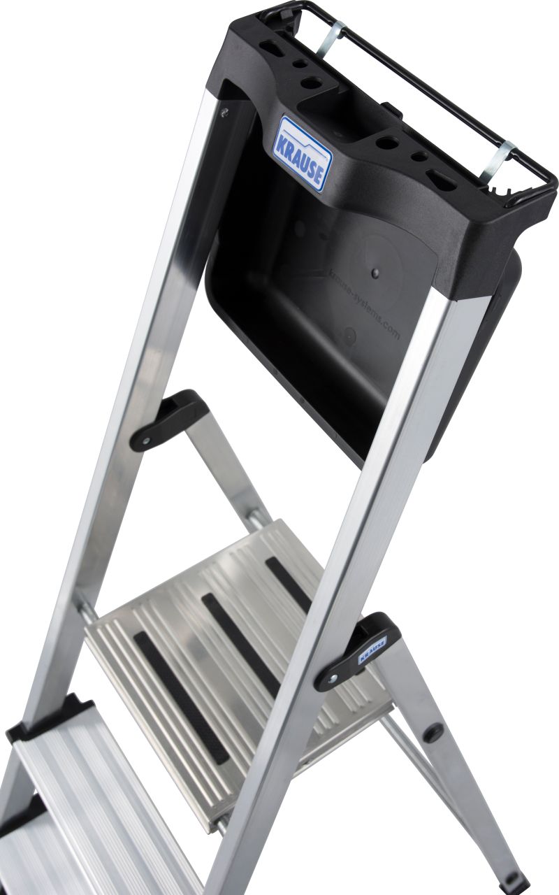Praktyczna i wszechstronna wolnostojąca drabina z platformą, ze specjalnym uchwytem na wiadro i ergonomiczną, obszerną półką na narzędzia.