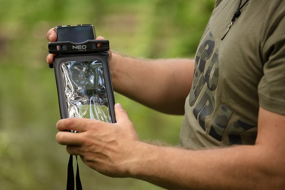 Etui wodoodporne na telefon NEO (nr ref. 63-135) wykonane jest z materiałów PVC i ABS. Zapewnia ochronę przed wodą potwierdzoną stopniem IPX8. Etui przeznaczane jest do urządzenia o maksymalnej średnicy 6.2”. Wymiary produktu: 19.5 x 11 cm