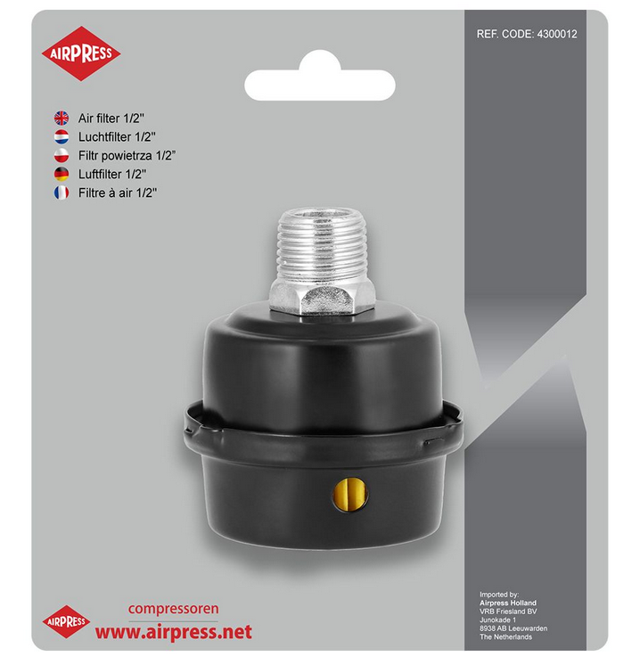 Filtr zassawny Airpress 4300012  jest przeznaczony do oczyszczania powietrza zasysanego przez kompresor. Filtr Airpress 4300012 jest zamknięty w obudowie z tworzywa sztucznego i posiada metalowy gwint przyłączeniowy 1/2''.  Stosowanie filtra chroni sprężarkę przed uszkodzeniem i wydłuża jej żywotność.