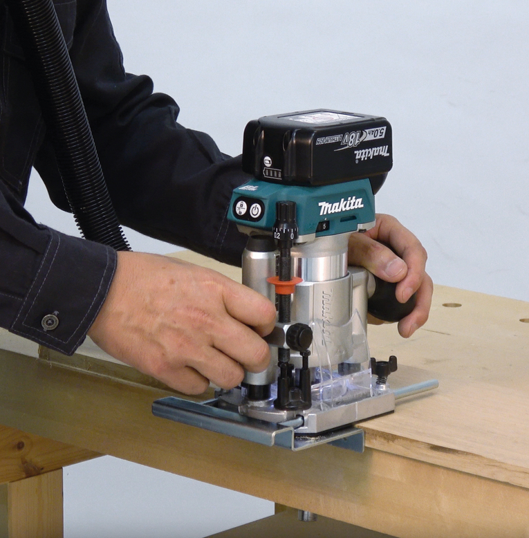 Akumulatorowa frezarka do krawędzi Makita DRT50RTJX2 zasilana akumulatorami 18 V to narzędzie do obróbki drewna np. do wykonywania elementów ozdobnych w profilach drewnianych i wielu innych prac stolarskich.