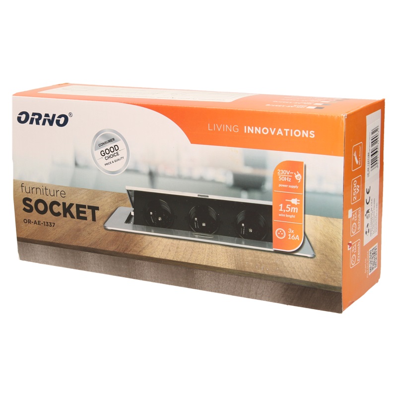 Zestaw trzech gniazd sieciowych z uziemieniem i przesłonami torów prądowych w obudowie chowanej w blat. Urządzenie przeznaczone jest do montażu w biurkach, blatach i stołach, może być zamontowane zarówno w pozycji pionowej jak i poziomej, zapewniając dostęp do gniazd elektrycznych. Zalecany przewód OWY 3 × 1,5 mm2 (brak w zestawie). Dostępne kolory: czarny, srebrny, złoty, mosiądz, grafit.
