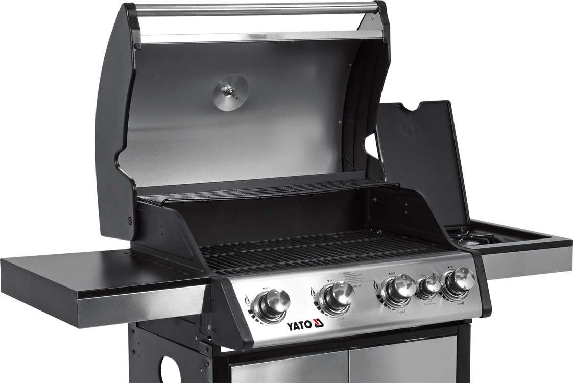 Nowocześnie wyglądający grill gazowy 4+1 wykonany ze stali nierdzewnej, wyposażony w niezawodny, żeliwny ruszt. Półki boczne oraz pojemna, zamykana szafka ułatwią przechowywanie przypraw i niezbędnych akcesoriów. Palnik boczny o mocy 2kW umożliwi gotowanie i podgrzewanie potraw w garnku i na patelni