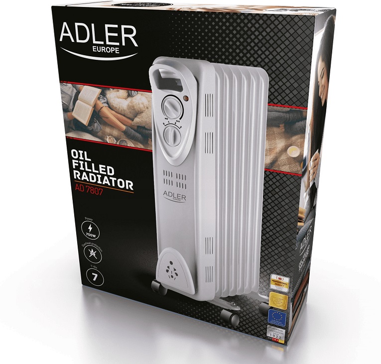 Bardzo wydajny grzejnik olejowy. Pomaga, gdy istnieje potrzeba dogrzania pomieszczenia, w którym nie ma grzejników lub te, które są nie są wystarczająco wydajne. Jest niezbędny w przypadku awarii systemu grzewczego. Grzejnik daje możliwość regulacji temperatury i posiada 2 stopnie grzania. Dla bezpieczeństwa urządzenie wyposażone jest w zabezpieczenie przed przegrzaniem. Grzejnik ma elegancki kształt, dzięki czemu nie przeszkadza wizualnie postawione w domu lub w biurze, do którego przychodzą goście lub klienci. Grzejnik olejowy AD 7807 ma 7 żeberek i ma moc 1500W.