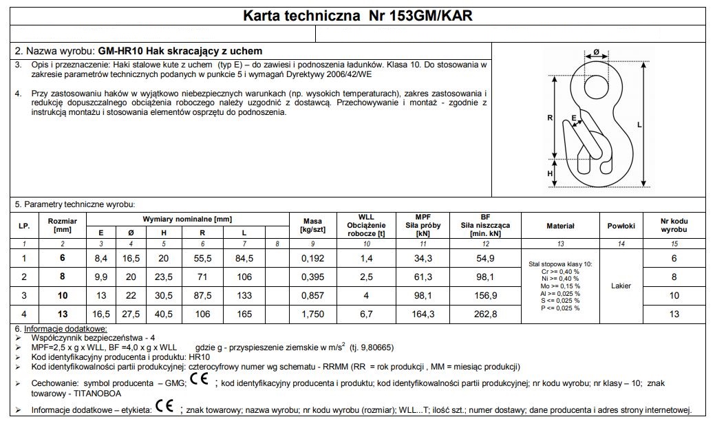 Hak skracający z uchem , "TITANOBOA" klasy "10" malowany proszkowo ,