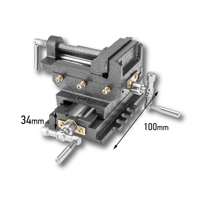 Imadło maszynowe krzyżowe dwuosiowe 100 mm 35-035 marki NEO to element z kowadłem, którego korpus wykonany jest z trwałego żeliwa HT200, szczęki hartowane ze stali 45#, a rękojeść z wysokiej jakości stali Q235.