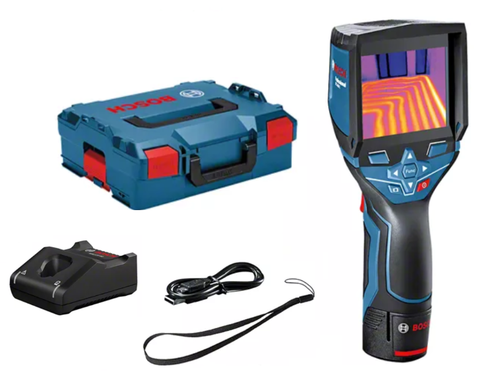 Kamera termowizyjna GTC 400 C Bosch Professional 601083101 to narzędzie do pomiaru i wizualizacji różnic temperatur. Urządzenie pozwala na łatwą i szybką rejestrację danych, które można przesłać za pośrednictwem aplikacji na urządzenia z systemem Android lub IOS i poddać szczegółowej analizie. Kamera GTC 400 C Bosch ma wbudowany czujnik podczerwieni, który mierzy w 19200 punktach, przez co generowany jest dokładny obraz termiczny obiektu. Prezentowany kolorowy obraz pozwala na obserwację różnic temperatur i diagnozowanie nieprawidłowości. Kamera GTC 400 C Bosch Professional sprawdzi się szczególnie do weryfikacji systemów grzewczych, awarii maszyn, skuteczności izolacji i wielu innych.