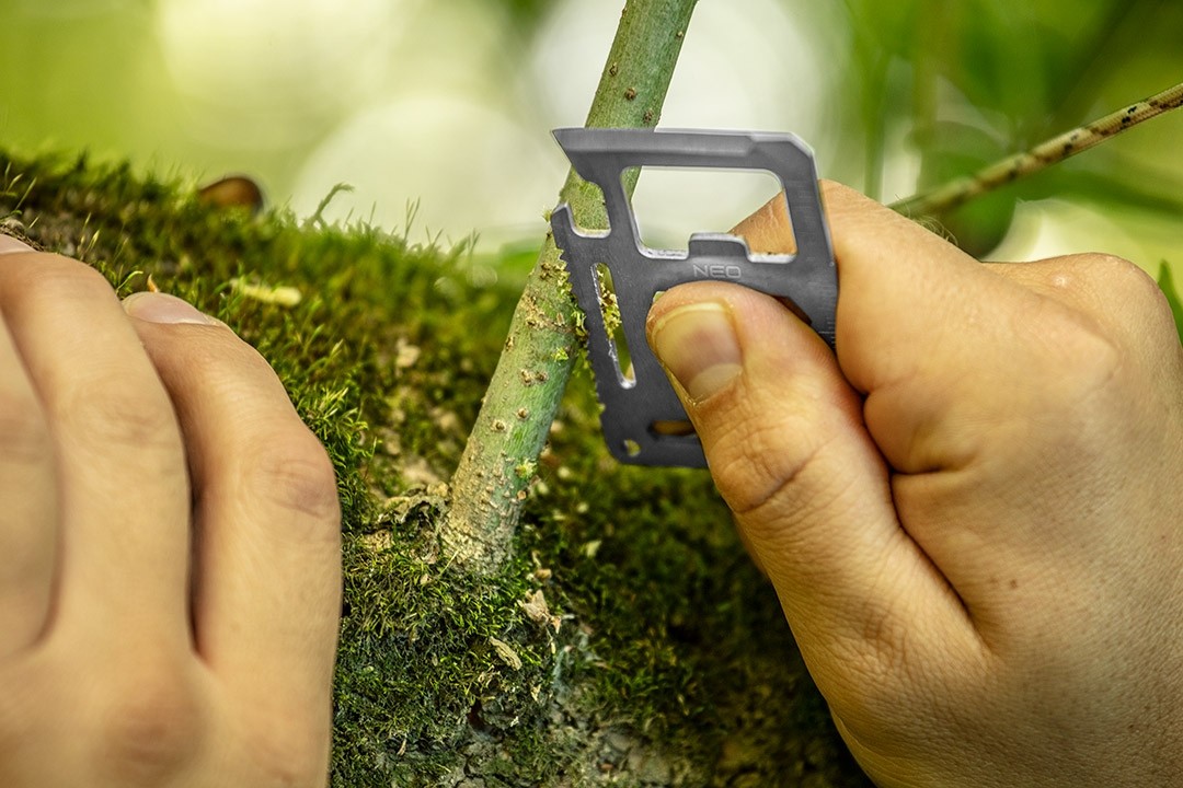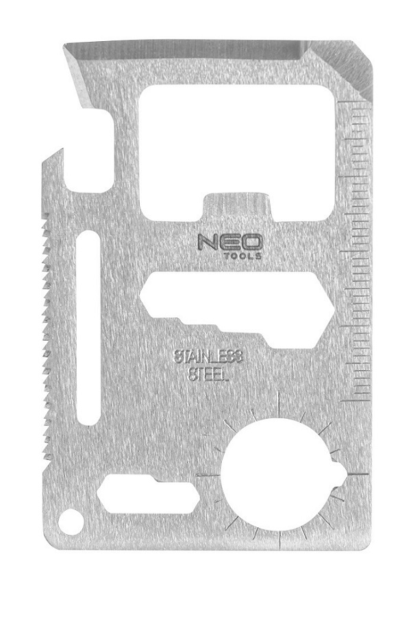 Karta przetrwania NEO (nr ref. 63-134) wykonana ze stali nierdzewnej to gadżet mieszczący się w portfelu. Zawiera 10 narzędzi: otwieracz do konserw oraz butelek, klucz motylkowy, piłę dwurzędową, klucz oczkowy w rozmiarach 4, 5, 6, 7, 8, 10 mm, wskaźnik mapowy, miarka 4 cm, wkrętak płaski, nóż. W komplecie znajduje się skórzany pouch.