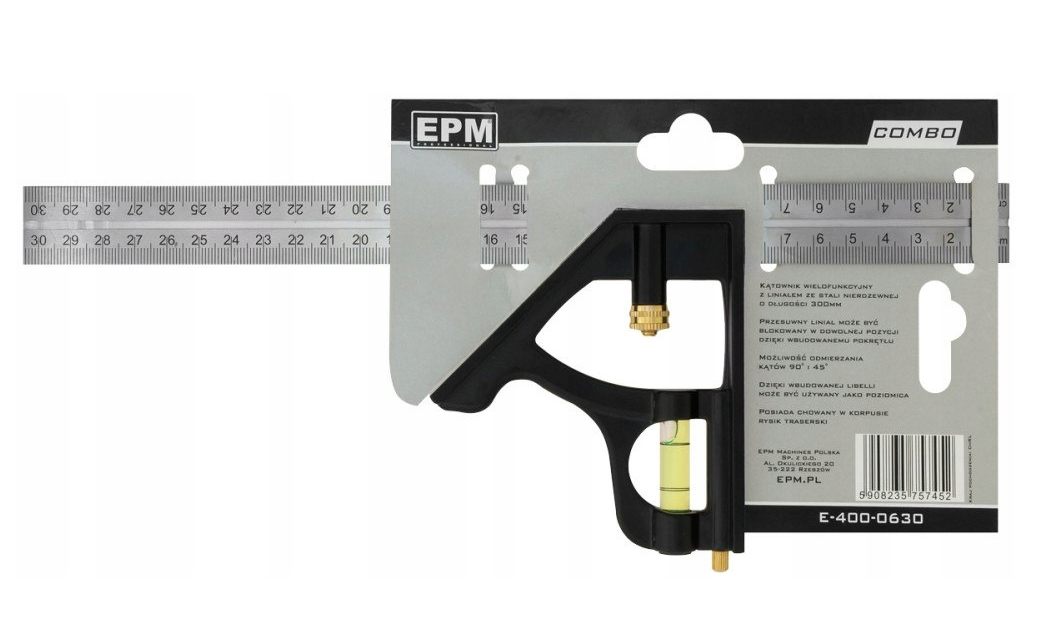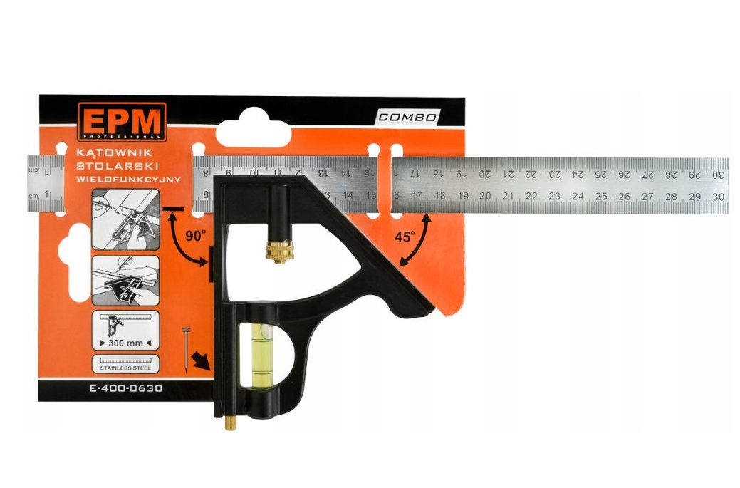 Kątownik nastawny EPM E-400-0630 to narzędzie do przenoszenia kąta, trasowania, pomiaru głębokości i wysokości oraz wyznaczania poziomu oraz pionu. Kątownik EPM E-400-0630 znajduje zastosowanie w wielu obszarach np. jako przyrżnia kątowa do wyznaczania kąta cięcia. Narzędzie E-400-0630 posiada przesuwany liniał z naniesioną podziałką metryczną blokowany w dowolnej pozycji oraz libellę, która pozwala określić poziom lub pion.