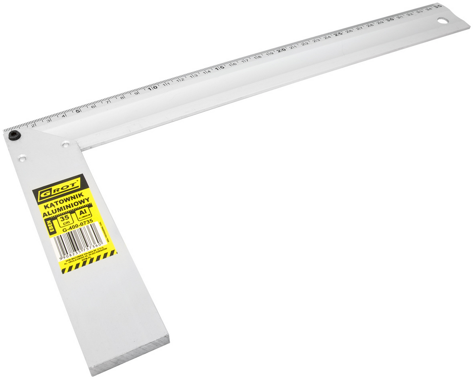 Kątownik uniwersalny Grot G-400-0735 to narzędzie do pomiaru kąta prostego i wyznaczania kąta 45° oraz trasowania. Kątownik Grot G-400-0735 posiada listwę aluminiową z naniesioną podziałką metryczną do 350 mm oraz stopkę. Narzędzie pozwala na kontrolę kąta prostego oraz trasowanie długości i linii równoległych.