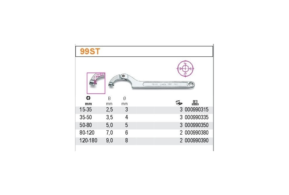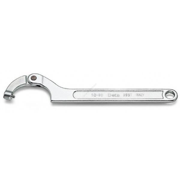 Beta Klucz hakowy z okrągłym bolcem, przegubowy 80-120mm to charakterystyczny klucz z końcówką w kształcie haka i okragłym bolcem, przeznaczony do uszkodzonych i zniszczonych śrub i nakrętek. Specjalna budowa klucza umożliwia zahaczenie uszkodzonej śruby i jej wykręcenie w celu wymiany na nową. Jest to specyfincze narzędzie, jednak często niezbędne. Produkt został dodatkowo wyposażony w przegub dla ułatwienia złapania śrub i nakrętek o różnych średnicach, oraz okrągły bolec, który umożliwia zahaczenie uszkodzonego elementu po wcześniejszym wywierceniu w nim otworu.