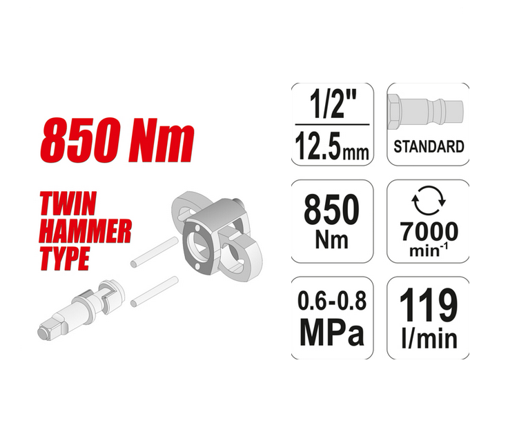 Klucz pneumatyczny 1/2" Yato YT-09525 850NmKlucz pneumatyczny 1/2Klucz pneumatyczny 1/2