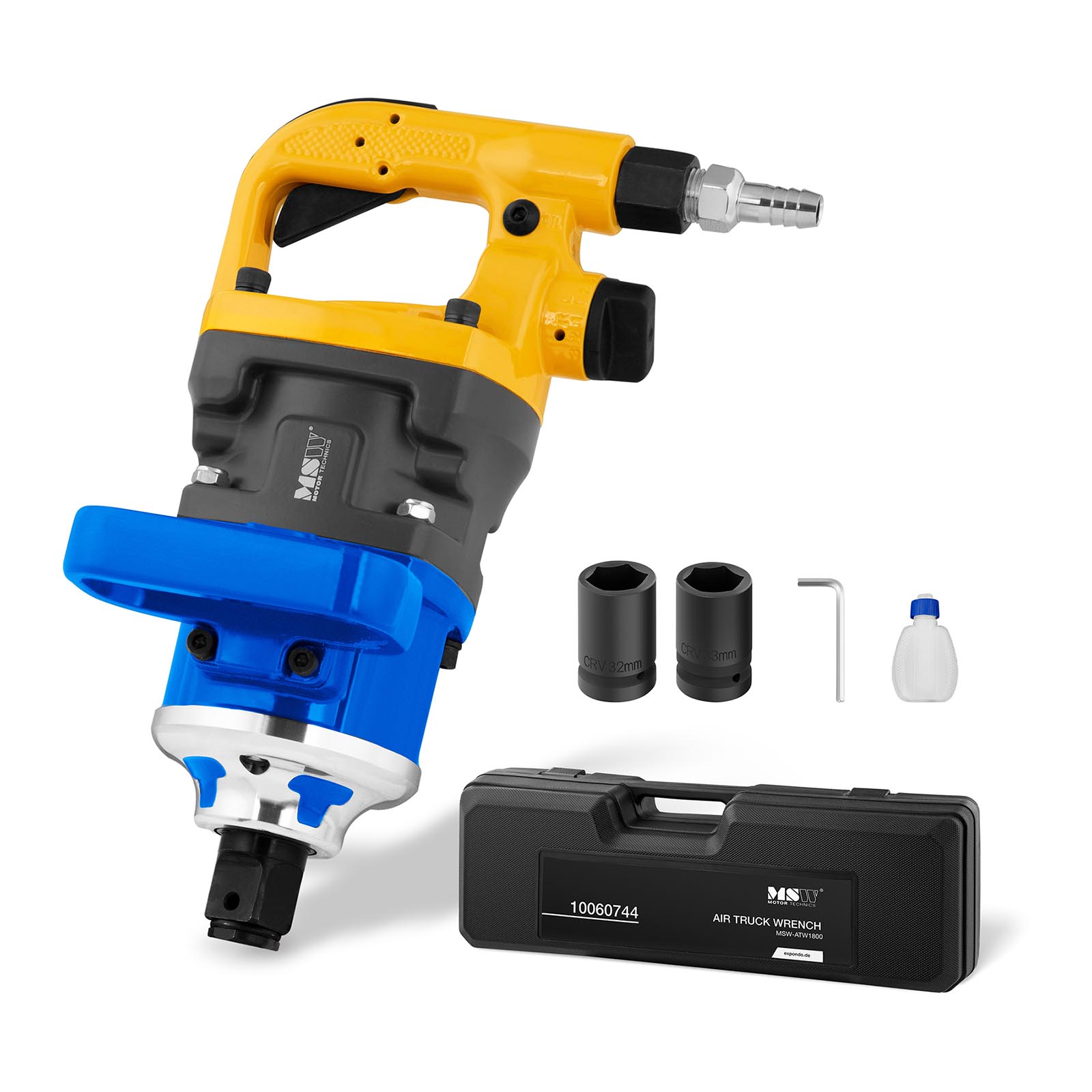 • - Zestaw - poręczna walizka, złącze 1/2, 2 nasadki (32 i 33 mm), klucz imbusowy, śruby do montowania, podkładki sprężynowe i butelka na olej.
