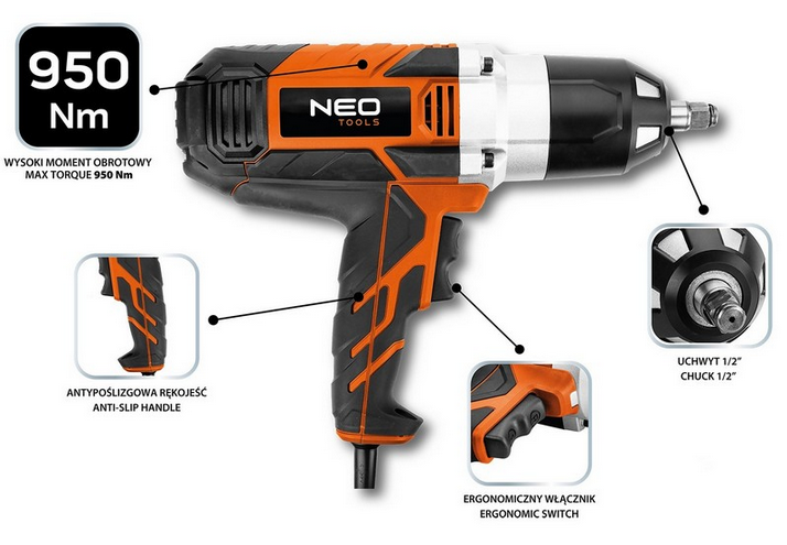 Ergonomiczny kształt klucza zapewnia komfort pracy w każdych warunkach. Neo 04-720 jest zasilany elektrycznie, dzięki czemu nie wymaga instalacji pneumatycznej, co czyni go bardziej dostępnym i praktycznym narzędziem.