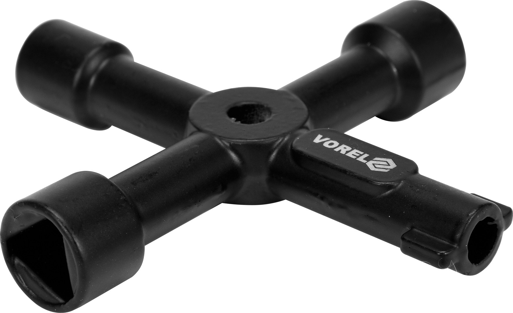 Kluczyk o wymiarach 72 x 72 mm, ramiona fi 9 mm, końcówki o profilach trójkątnym 2x kwadrat i okrągły z wypustami /