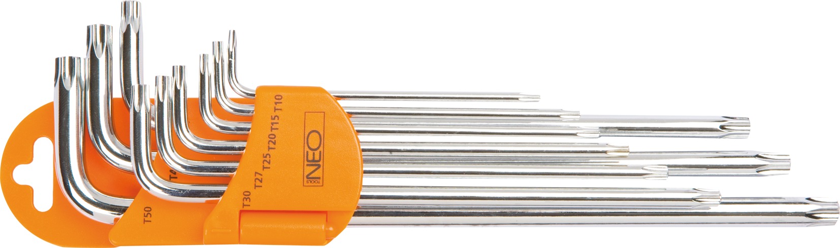 Zestaw kluczy Torx NEO zawiera 9 kluczy w rozmiarze od T10 do T50.