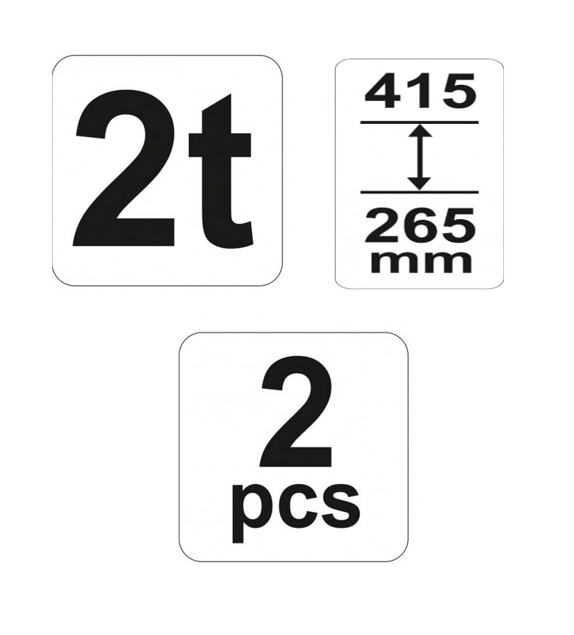Podstawki samochodowe Yato YT-17310 to oprzyrządowanie warsztatowe służące podtrzymywania pojazdów lub innych elementów na wysokości. Podstawki pod samochód posiadają udźwig 2 ton każda oraz regulację wysokości od 265 do 415 mm, wyposażoną w zapadkowy układ blokady wysokości, dodatkowy klin, co gwarantuje łatwą i bezpieczną obsługę. Kobyłki pod samochód Yato YT-17310 zostały wykonane z wytrzymałej stali i pokryte powłoką antykorozyjną.