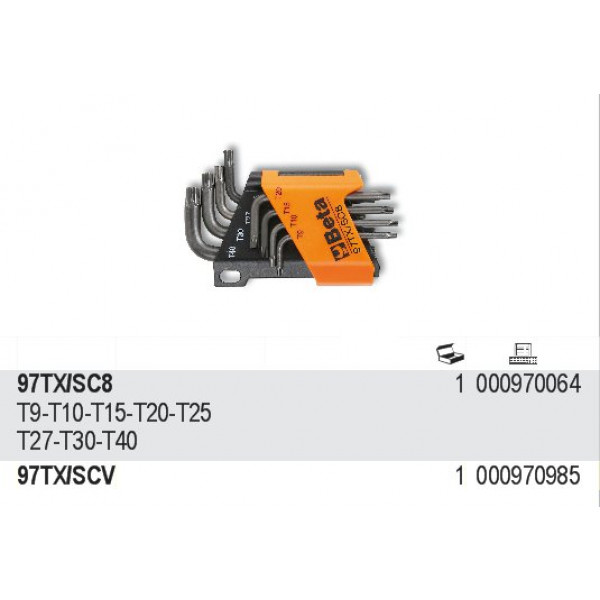 Beta Zestaw kluczy trzpieniowych kątowych TORX@ w uchwycie T9-T40 8szt. to zestaw 8-miu kluczy trzpieniowych kątowych TORX® (Seria 97TX) T9-T10-T15-T20-T25-T27-T30-T40.
