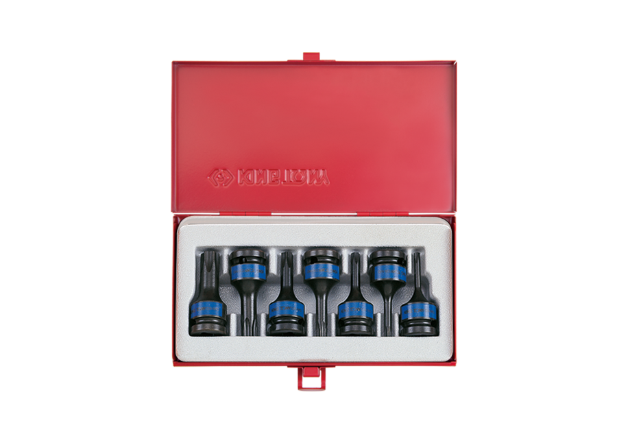 Zestaw 7 nasadek udarowych 1/2" z końcówką torx firmy King Tony. W zestawie znajdują się nasadki w rozmiarach T25, T30, T40, T45, T50, T55, T60. Zestaw w czerwonej, metalowej kasecie