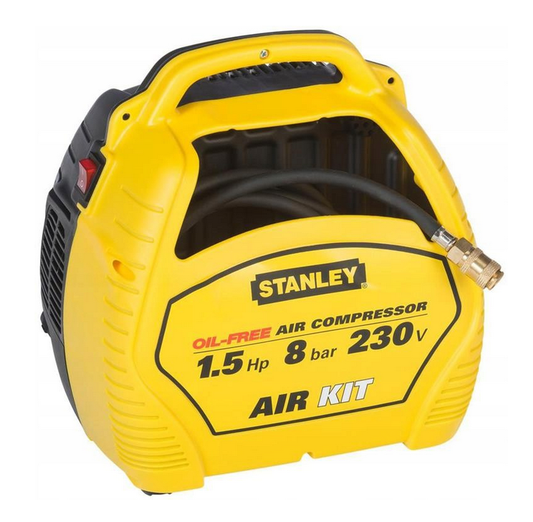 Kompresor bezolejowy Air Kit Stanley 8Bar 8215190STN595 to profesjonalne urządzenie do generowania sprężonego powietrza stosowanego w różnorodnych zadaniach domowych, majsterkowaniu i pracach hobbystycznych. Kompresor Stanley 8Bar 8215190STN595 generuje ciśnienie robocze na poziomie 8 barów. Bezolejowa konstrukcja kompresora eliminuje potrzebę konserwacji i zapewnia czyste powietrze. Moc silnika wynosząca 1,5 KM (1100 W) oraz wydajność 180 l/min. i prędkość obrotowa 3400 obr/min zapewniają odpowiednie osiągi podczas pracy. Sprężarka bezolejowa Stanley 8Bar 8215190STN595 idealnie sprawdzi się do pompowania kół w samochodzie, rowerze lub innym sprzęcie, a także do czyszczenia, przedmuchiwania, malowania aerografem i wielu innych zastosowań, które wymagają dostarczania sprężonego powietrza.