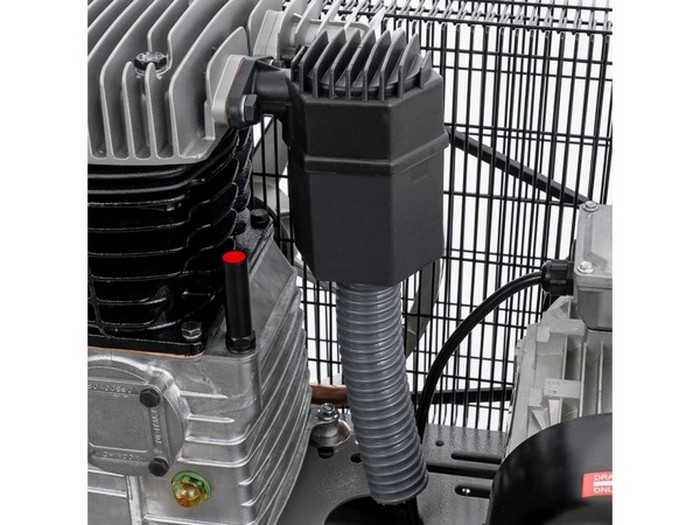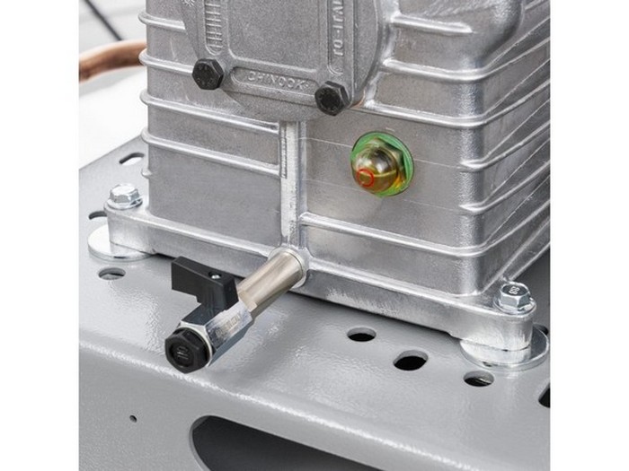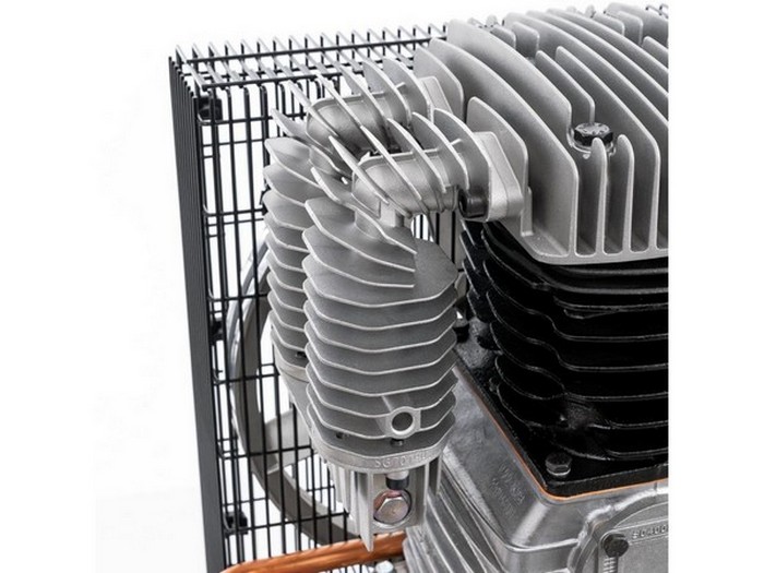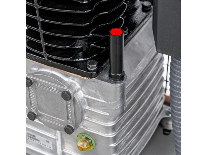 Kompresor posiada żebra chłodzące i koło zamachowe, dzięki czemu sprężone powietrze jest zimniejsze, a powietrze jest lepiej sprężane w zbiorniku ciśnieniowym. Sprężarka wyposażona jest w dwa manometry. Manometr na uchwycie i przełącznik ciśnienia wskazują ciśnienie w kotle, manometr na czerwonym pokrętle, który jest zamontowany na regulatorze, pokazuje ustawione ciśnienie. Sprężarka działa na przepływie mocy.