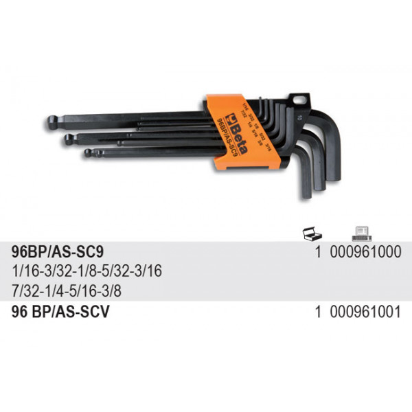Beta Zestaw kluczy trzpieniowych kątowych calowych z końcówką kulistą w uchwycie 1/16x3/8'' 9szt. 000961000 to zestaw 9-ciu kluczy trzpieniowych kątowych z kulistą końcówką, calowych (Seria 96BP/AS) 1/16-3/32-1/8-5/32-3/16-7/32-1/4-5/16-3/8.