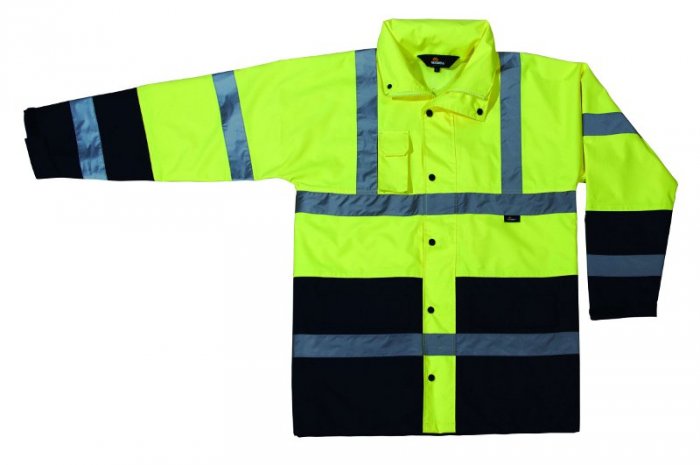 Kurtka ocieplana przeciwdeszczowa z chowanym kapturem ostrzegawcza o intensywnej widzialności w kontrastowych kolorach, kurtka ostrzegawcza VIZWELL VWJK05