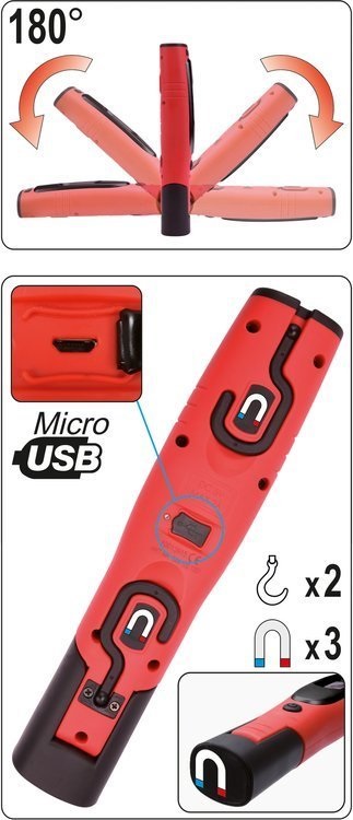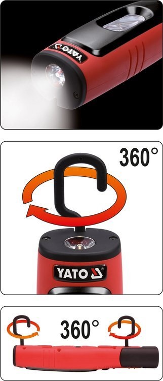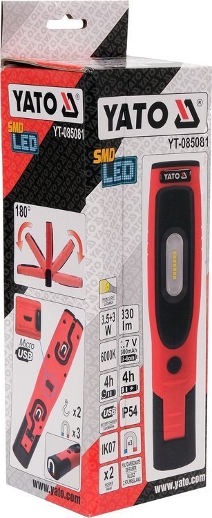 Akumulatorowa lampa warsztatowa YATO ze światłem głównym 330lm oraz latarką 80lm. Model wyposażony w pojemną, litowo-jonową baterię o pojemności 2600mAh zapewni minimum 4h ciągłej pracy. Wykonany z wytrzymałych materiałów, m.in. ABS i poliwęglanu, które zapewniają klasę ochrony mechanicznej IK07 oraz klasę szczelności IP54. Obrotowy korpus, 2 haczyki oraz 3 magnesy umożliwią właściwe ustawienie strumienia światła