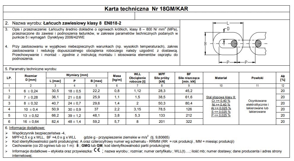 Łańcuch krótkoogniwowy EN 818-2 ECOAT kl.8 bocznie zgrzewany o wysokiej wytrzymałości , ocynkowany i lakierowany elektroforetycznie ( kolor czarny ) , w wiązce po 50 mb. , rozmiar 8mm , ok.1,40kg/mb .