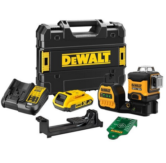 Laser krzyżowy Dewalt DCE089G18 urządzenie emitujące wiązkę w kolorze zielonym do wyznaczania poziomu lub pionu przy różnorodnych pracach budowlanych, montażowych i wykończeniowych. Laser Dewalt DCE089G18 posiada funkcję samopoziomowania w zakresie ± 4° co nie wymaga ręcznej korekty. Dzięki wysokiej klasie szczelności IP54 umożliwia pracę w trudnych warunkach.