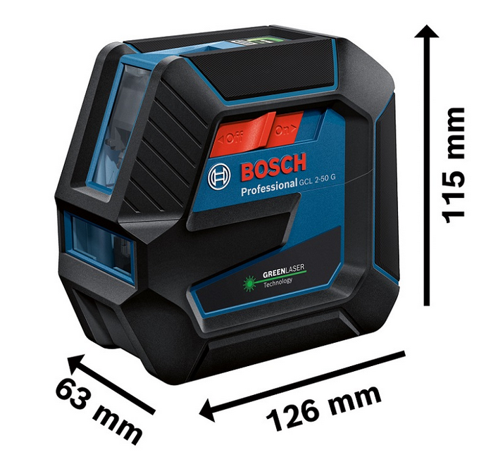 Laser krzyżowy Bosch GCL 2-50G urządzenie emitujące wiązkę w kolorze zielonym do wyznaczania poziomu lub pionu przy różnorodnych pracach budowlanych, montażowych i wykończeniowych. Laser krzyżowy wyposażony  w funkcję samopoziomowania w zakresie +/-4° co nie wymaga ręcznej korekty. Obsługa lasera tylko jednym przyciskiem, co ułatwia obsługę urządzenia. Dzięki wysokiej klasie odporności IP 64 umożliwia pracę w trudnych warunkach.
