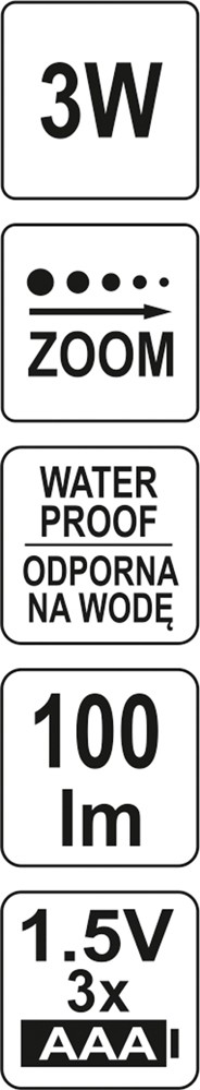 funkcja zoom z soczewką PMMA umożliwiająca zmianę skupienia wiązki światła i oświetlanie przedmiotów oddalonych nawet o 100 m)