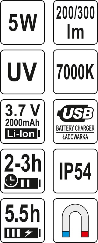 Uniwersalna, podręczna latarka, która przyda się w różnych okolicznościach - w warsztacie, na budowie czy na wycieczce. Dzięki wbudowanej lampie UV umożliwi diagnozowanie układów klimatyzacji samochodowej, poszukiwanie bursztynów czy testowanie banknotów. Dodatkową zaletą jest wodoodporność (IP54) oraz magnetyczna podstawa na spodzie i na klipsie latarki.