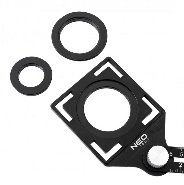 Linijka kątowa 6 ramion Neo 72-351 to narzędzie pomiarowe stosowane do odwzorowywania i przenoszenia kształtów. Linijka została wykonana z aluminium, a szablon otworów z tworzywa sztucznego ABS. Linijka posiada 6 ramion o długości skali od 0 do 6 cm w obu kierunkach. Końcówka linijki wyposażona została w szablon do wyznaczania otworów o średnicy: 2.5 cm, 4 cm i 4.5 cm.