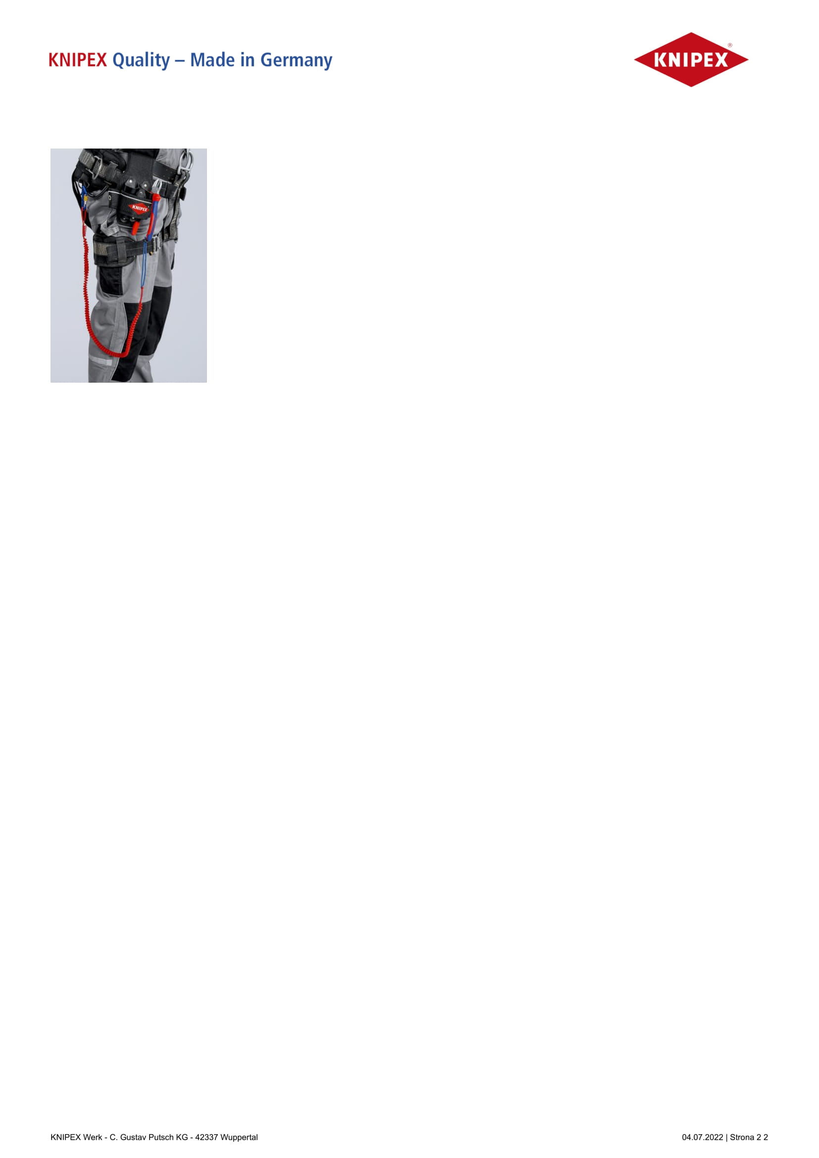 Przeznaczone do zastosowania w budownictwie na- i podziemnym, pracach konserwacyjnych w budynkach dla alpinistów przemysłowych, alpinistów górskich, dekarzy, w sporcie wspinaczkowym, budowie stoisk targowych Zapewnia skuteczną ochronę przed upadkiem narzędzia Zapobiega zgubieniu narzędzia, zranieniu innych osób bądź uszkodzeniu przedmiotów Duży promień roboczy: długa linka zabezpieczająca zapewnia komfort pracy Wszechstronne zastosowanie: linkę zabezpieczającą można zamocować za pomocą sznurka bezpośrednio na nadgarstku, do paska, uprzęży wspinaczkowej itd. Możliwość zamocowania narzędzi KNIPEX Tethered Tools* także bez karabińczyka Linka zabezpieczająca z fałdowanej taśmy rozciąga się pod obciążeniem na długość ok. 1,5 m Pasek z taśmą po jednej stronie i wszytym sznurkiem ze stoperem po drugiej stronie Nie wolno stosować do zabezpieczania osób! Maks. obciążenie: masa narzędzia 1,5 kg Pasuje do wszystkich szczypiec KNIPEX z zaczepem Linka rozciąga się do długości około 260 mm (10"). Sztywny, aby uniknąć kontaktu z obiektami znajdującymi się poniżej. Przed użyciem należy dokładnie przeczytać wszystkie ostrzeżenia i instrukcje na produkcie i opakowaniu. NO PPE = brak środków ochrony osobistej Tylko do mocowania narzędzi z gamy produktów KNIPEX Tethered Tools połączonych zgodnie z instrukcjami systemu zabezpieczającego przed upadkiem. Nie używać w pobliżu ruchomych lub obracających się urządzeń Nie utrzyma ciężaru człowieka Sprawdzić poziom zużycia przed każdym użyciem. Nie stosować w przypadku stwierdzenia oznak zużycia.