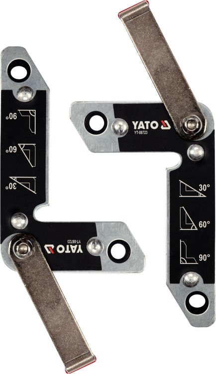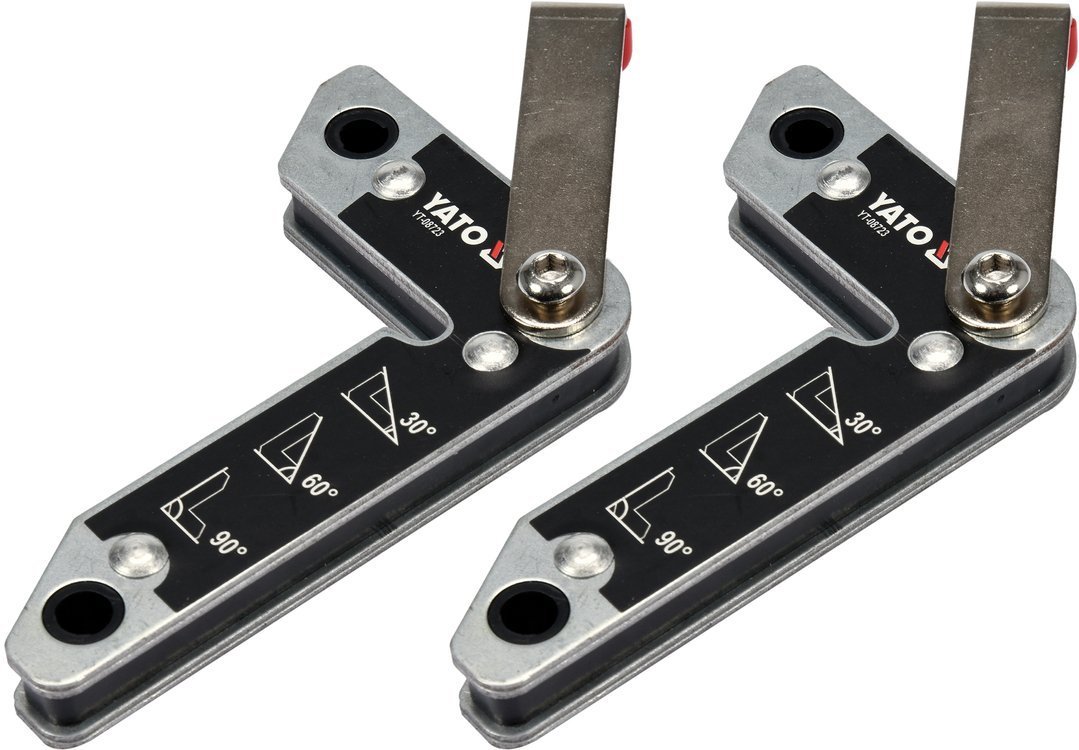 Zestaw 2 magnetycznych kątowników stosowanych przy pracach spawalniczych i montażu pod kątem różnych elementów: blach, łączników, płaskowników, profili, rur etc.