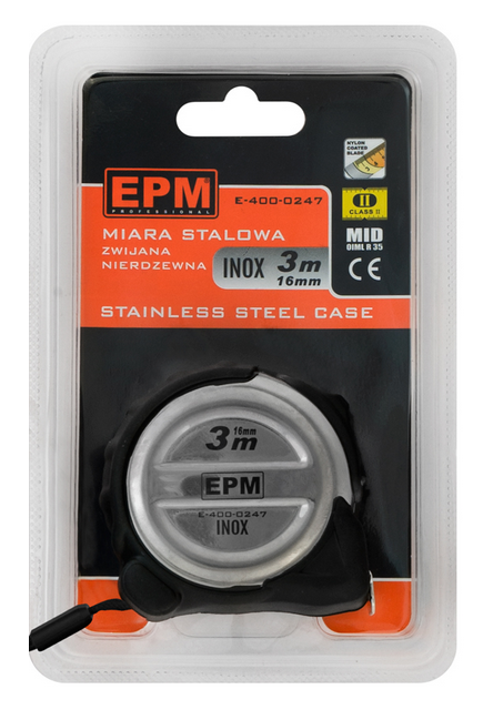 Miara zwijana 3m Inox EPM E-400-0247 to narzędzie do pomiaru długości do 3m. Miara została wykonana z taśmy stalowej obustronnie polakierowanej akrylem z powłoką nylonową zamkniętej w obudowie ze stali nierdzewnej pokrytej gumą. Miara stalowa EPM E-400-0247 posiada mechanizm blokady zwijania taśmy z funkcją STOP. Gumowa powłoka antypoślizgowa na obudowie zabezpiecza przed wyśliźnięciem się miary oraz chroni ją przez wstrząsami podczas upadku.