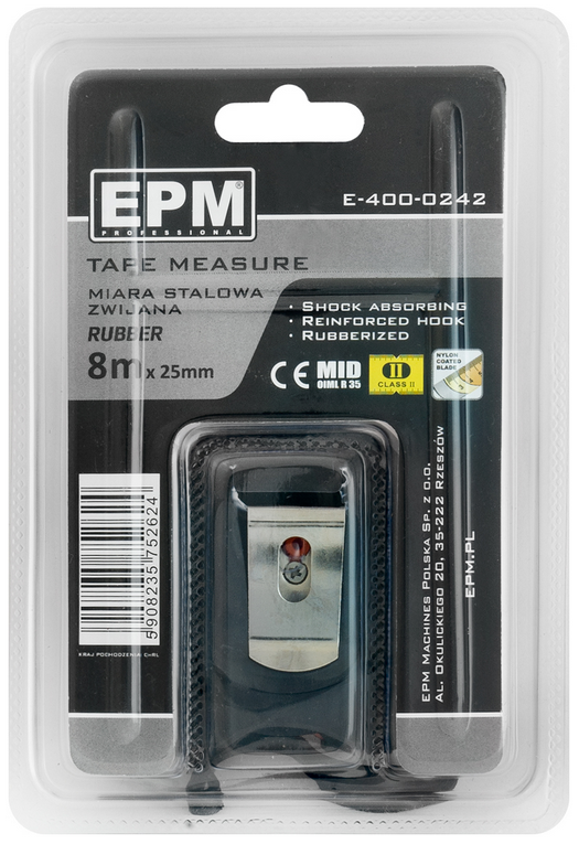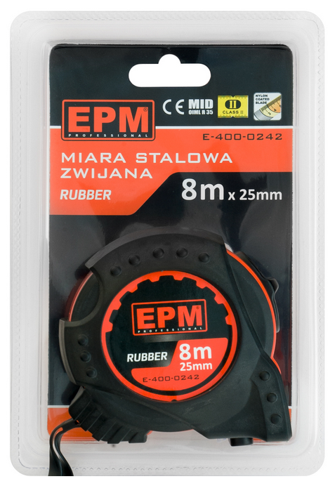 Miara zwijana 8m Rubber EPM E-400-0242 to narzędzie do pomiaru długości do 8m. Miara została wykonana z taśmy stalowej obustronnie polakierowanej akrylem z powłoką nylonową zamkniętej w obudowie z tworzywa sztucznego. Miara stalowa Rubber EPM E-400-0242 posiada mechanizm blokady zwijania taśmy wyposażony w dwa hamulce. Gumowa powłoka antypoślizgowa obudowy zabezpiecza przed wyśliźnięciem się miary oraz chroni ją przez wstrząsami podczas upadku.